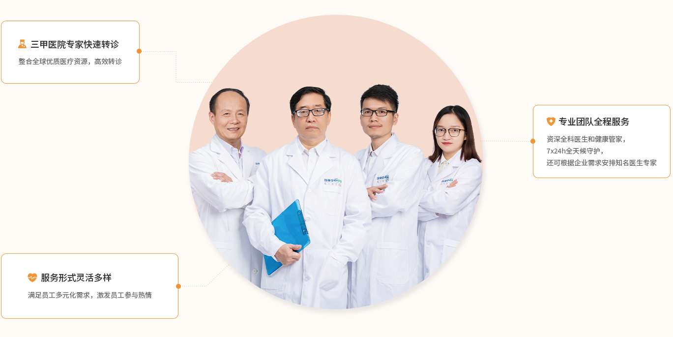 资深全科医生和健康管家, 7x24h全天候守护, 还可根据企业需求安排知名医生专家